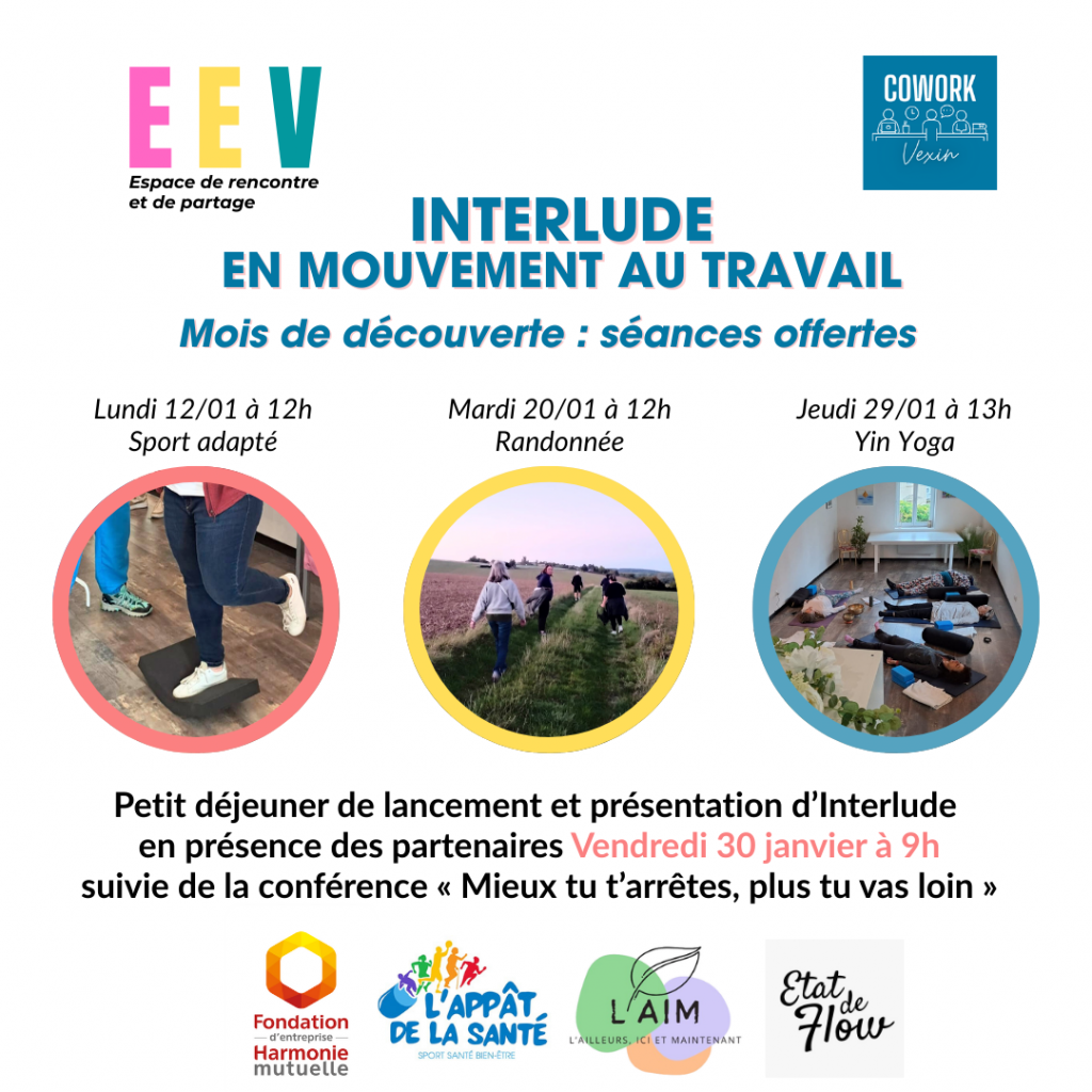 🤸♀️🌿 INTERLUDE – En mouvement au travail✨ Mois de découverte : séances offertes Pour bien démarrer l’année, nous vous proposons...