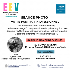 💼 SÉANCE PHOTO – Votre portrait professionnel Renforcez votre communication avec un portrait professionnel réalisé avec bienveillance et expertise 📸2 portraits différents livrés en HD numérique. 📅 Mardi 18 novembre • 10h-13h📍 Cowork Vexin – Magny-en-Vexin📸 Avec Agnès Gelin – Tant de Lumière Photographie💰 105€ / 90€ adhérents EEV🔗 Réservation sur https://my.weezevent.com/seance-photo-portrait-au-cowork-vexin-le-181125